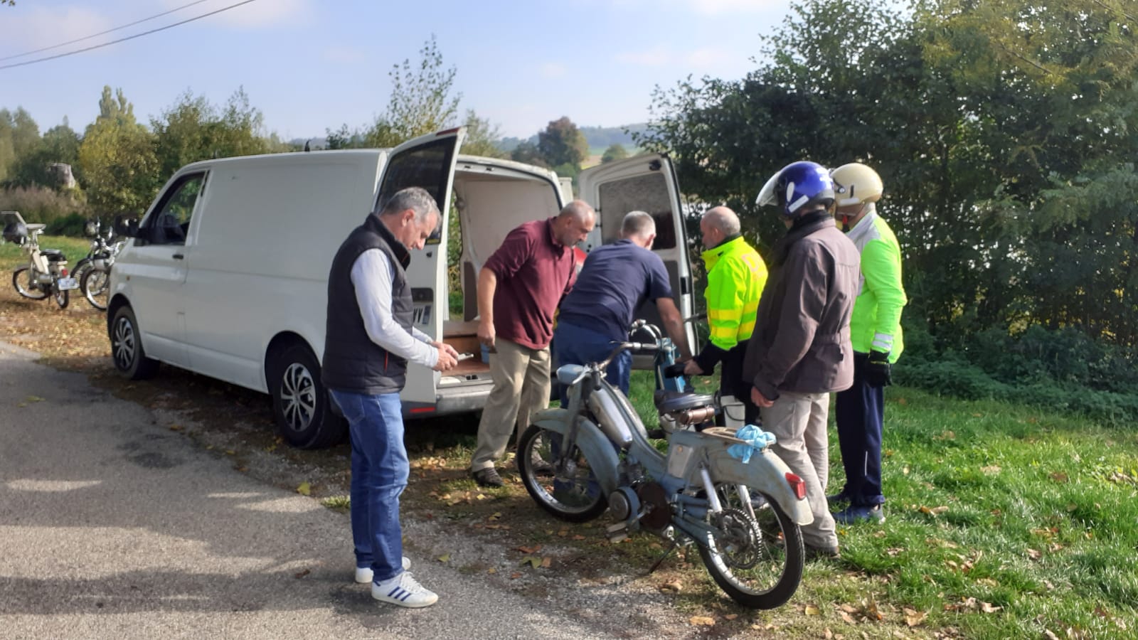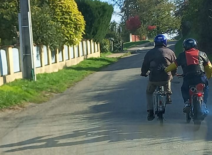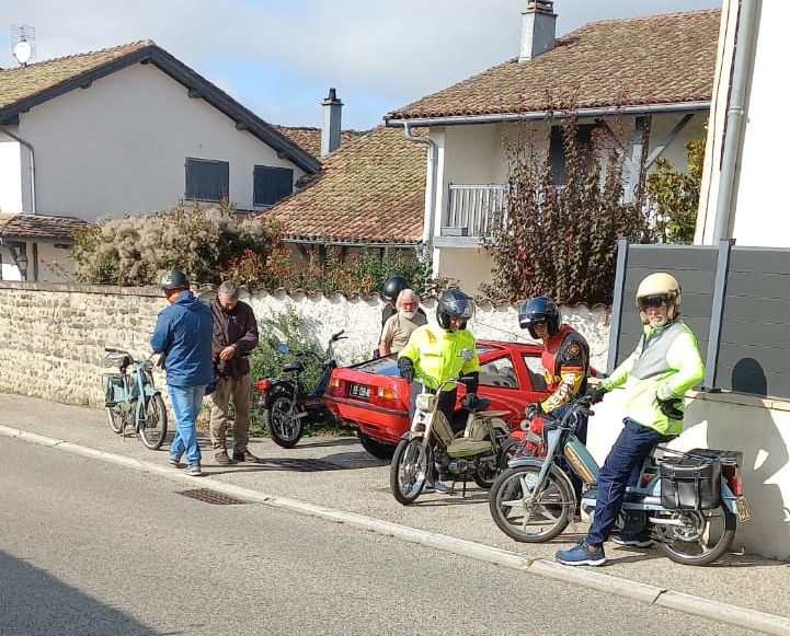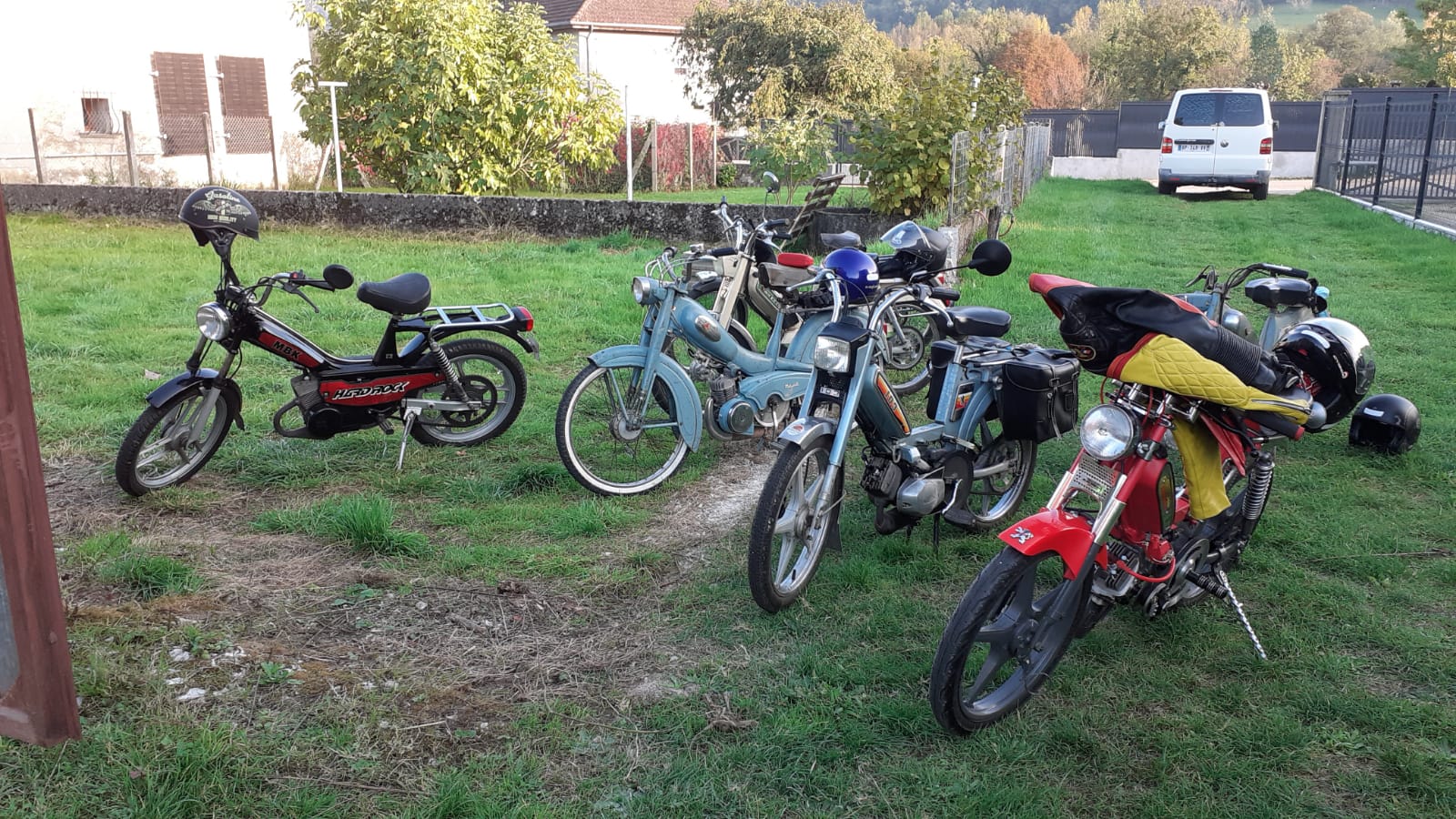 200 mètres, Stéphane perd une pièce de son plateau. Grace au véhicule d’assistance, son 103 est embarqué, il sera remplacé par une Motobécane . Le temps de transvaser l’essence, nous voici reparti. Les montées sont dures pour les plus vielle bécanes, et Elian pousse les plus poussives. On fait un détour pour le nouvel hangar de David, afin de déplacer la carrosserie de sa Cox. La montée de Vignieu est mortelle. On fini chez Alain, pour nous remettre de nos émotions. Nous sommes tous d’accord pour renouveler ce type de sortie.